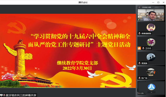 听取宋阳同志传达了《哈尔滨工程大学2022年工作要点》,做学院工作要点部署。一是持续优化学历继续教育专业建设;二是高等教育自学考试拓展升级省级网络助学考核平台;三是持续完善非学历教育项目办学,拓展培训服务领域。并结合党的十九届六中全会精神,组织研讨。他说,要持续深入学习贯彻党的十九届六中全会精神,更好把握和运用党的百年奋斗历史经验,按照国家政策和继续教育改革动向,积极思考,深入研究,推进学院转型,推动学校继续教育事业前行。与会党员围绕党的十九届六中全会精神,结合学校和学院重点工作进行了交流研讨。