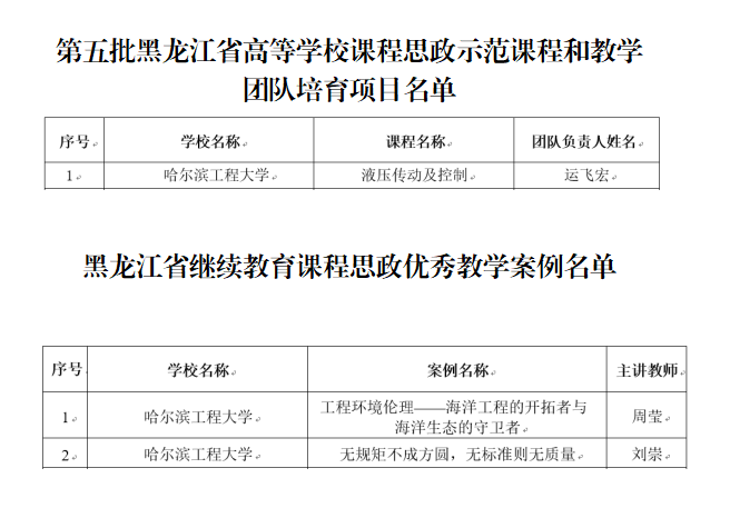 近日,黑龙江省教育厅公布《省级第五批职业教育(继续教育)课程思政示范课程和教学团队培育项目及优秀教学案例的通知》,共遴选出继续教育领域课程思政示范课程和教学团队培育项目27项,继续教育课程思政优秀教学案例31项。学院推荐的《液压传动及控制》继续教育本科课程获批省级课程思政示范培育项目,《工程环境伦理——海洋工程的开拓者与海洋生态的守卫者》《无规矩不成方圆,无标准则无质量》2项案例获批省级课程思政优秀教学案例。截至目前,suncitygroup太阳集团继续教育共获批省级课程思政示范项目4项,省级课程思政优秀教学案例4个。